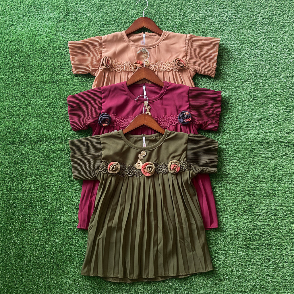 এক্সক্লুসিভ ডিজাইন: টপসের হাতায় ও সামনে সুন্দর কুঁচি এবং ফুলের কাজ করা হয়েছে, যা দেখতে খুবই প্রিমিয়াম।